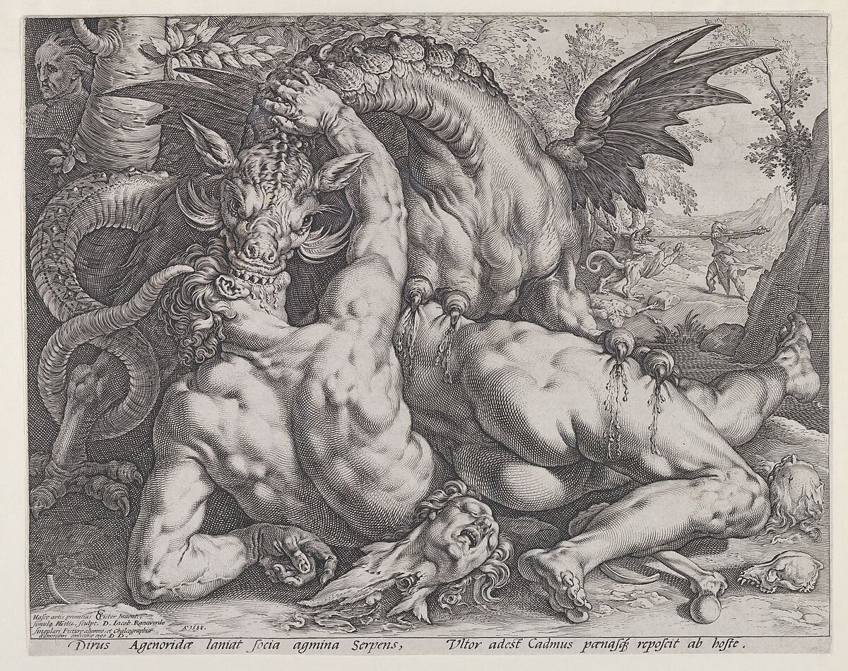 In the foreground we are confronted with the intertwined nude bodies of two ofsoldiers. rs . The dragon has seized the head of one in his teeth while at the same time pinning down the second by clutching his thigh and torso with his claws. Blood drips from the mens’ wounds. Two apparently freshly decapitated heads, as well as some bones litter the ground beneath the struggling figures. The heavily muscled bodies and dramatic poses recall Goltzius’s engravings of the Four Disgracers (accession no. 53.601., 4, 5(3,4,5 and 65), also after designs by Cornelis van Haarlem and from the same year.