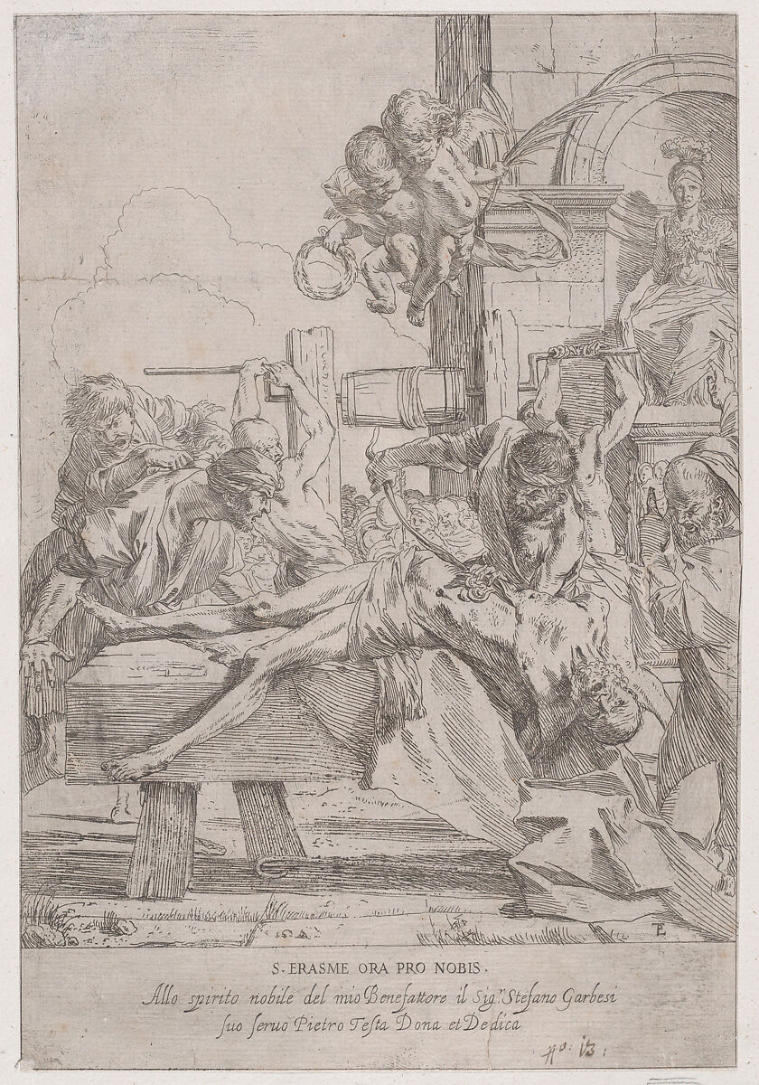- Title: The martyrdom of Saint Erasmus who is prostrate having in innards removed, two putti above holding the crown and palm of martyrdom