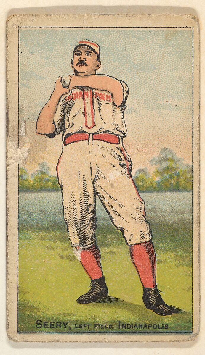 (Emmett) Seery (Hands At Right Shoulder), Left Field, Indianapolis, trade card from the "Gold Coin" series (N284), issued by D. Buchner in 1887 to promote Gold Coin Chewing Tobacco. In the American Card Catalog, Burdick refers to the series as "Leading Baseball Players, Police Inspectors and Captains, Jockeys, and Actors." The images in this series do not always represent the specific athletes named.