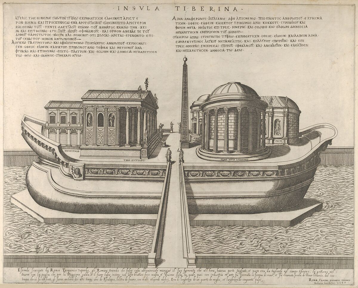 - Title: View of the Tiber Island represented as a ship, the Temple of Aesculapius at left