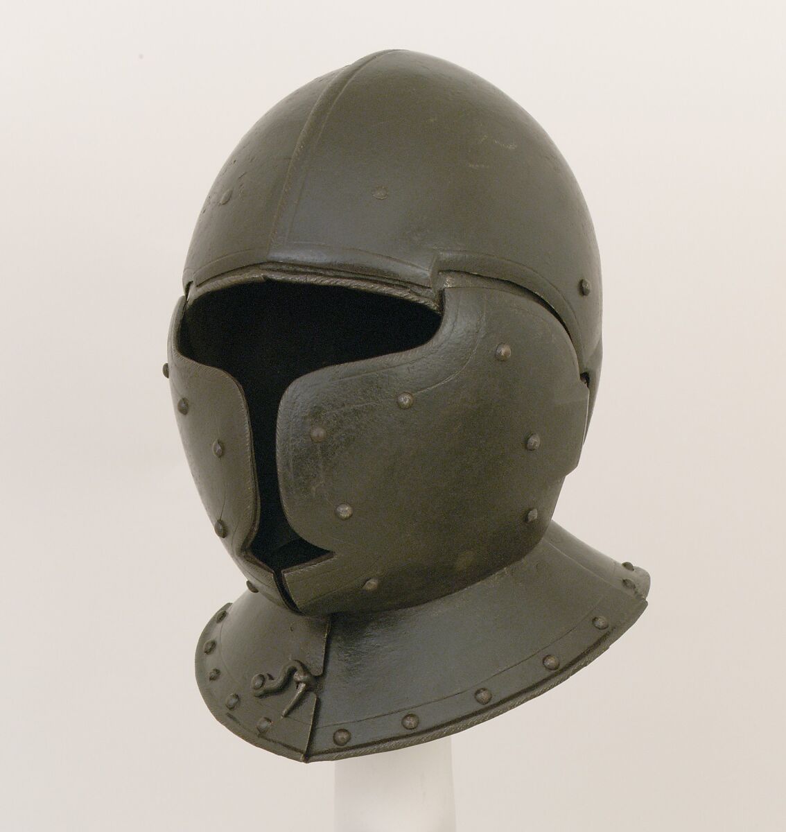 Siege engineers, sappers, and bombardiers regularly came under fire at close range and thus were equipped with extraordinarily heavy shot-proof armor. The bowl and cheeks of this example are protected by a double thickness of plates. The right side of the bowl has a proofmark––the dent caused by a bullet fired at a prescribed distance as proof of the armor plate's strength––but the shot did not penetrate the sturdy reinforce to the bowl below.