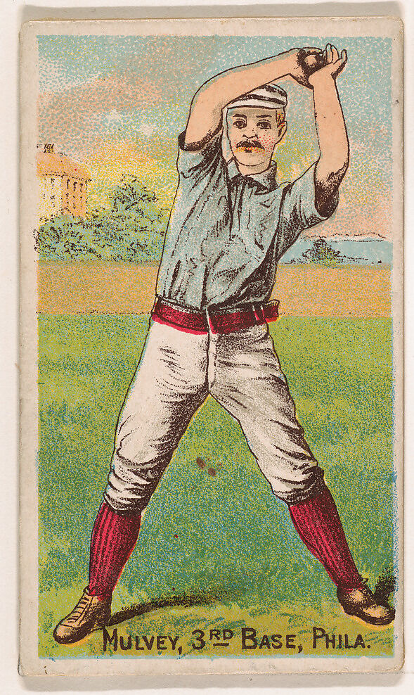 (Joe) Mulvey (Hands Above Head), 3rd Base, Philadelphia, trade card from the "Gold Coin" series (N284), issued by D. Buchner in 1887 to promote Gold Coin Chewing Tobacco. In the American Card Catalog, Burdick refers to the series as "Leading Baseball Players, Police Inspectors and Captains, Jockeys, and Actors." The images in this series do not always represent the specific athletes named.