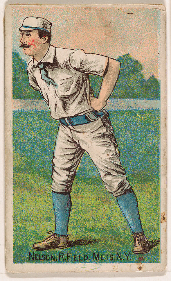 (Candy) Nelson, Right Field, Mets, New York, trade card from the "Gold Coin" series (N284), issued by D. Buchner in 1887 to promote Gold Coin Chewing Tobacco. In the American Card Catalog, Burdick refers to the series as "Leading Baseball Players, Police Inspectors and Captains, Jockeys, and Actors." The images in this series do not always represent the specific athletes named.