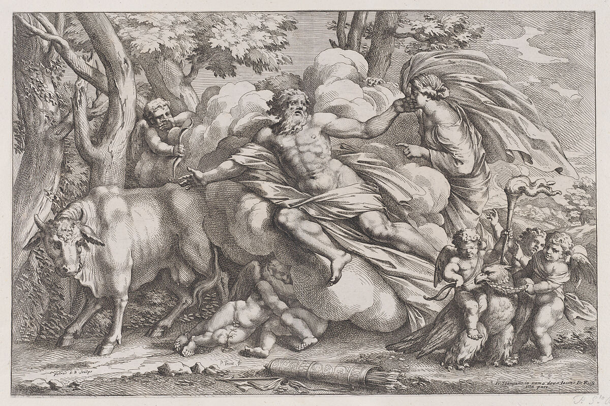 - Title: Io at the left as a cow, Jupiter on a cloud in the centre and Juno at the right with putti holding an eagle captive in the lower right