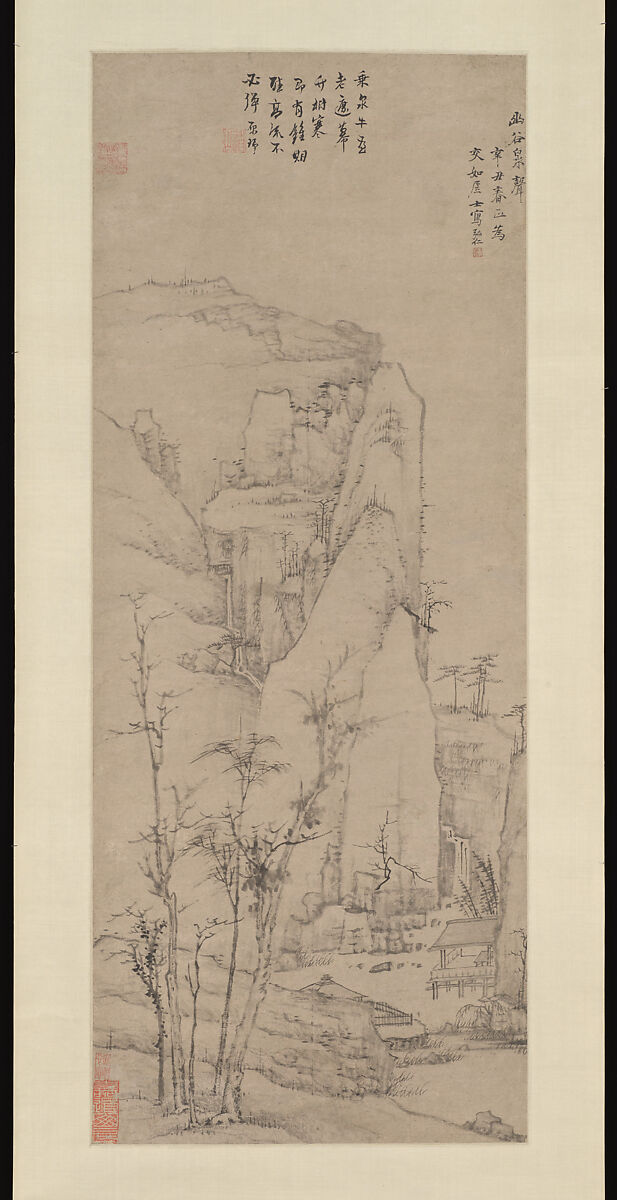 Hongren favored a dry linear technique that echoes the style of the Yuan dynasty recluse-painter Ni Zan (1306–1374). In this scroll Ni's influence is apparent in the spindly foreground trees and angular rock formations. The diminishing scale of the trees helps define recession and emphasizes the overwhelming size of the towering cliff at center, which dominates the composition and imparts a monumentality similar to that of the grandly scaled peaks of Northern Song (960–1127) works.