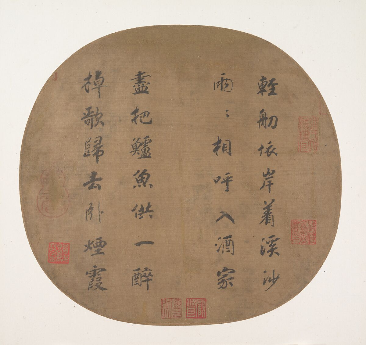 Following his abdication in 1162, Gaozong lived another twenty-five years in retirement with his wife, the empress Wu (1115–1197), devoting himself to scholarly and artistic pursuits. This poem, written in running script, may be a late work. The poem embellishes a round silk fan, a favored new format in Southern Song imperial art. By the late twelfth century, all silk fans were embellished with a painting on one side and a poem on the other, the image and the words complementing each other. The retired emperor often inscribed fans to bestow as gifts. The poems, when not original works by the emperor, were taken from anthologies of Tang or early Song poetry.