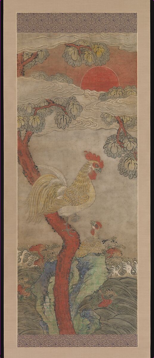 This work combines two established genres in Korean painting: birds and flowers, and the ten symbols of longevity (sun, mountains, water, rocks, clouds, pine trees, tortoises, cranes, deer, and mushrooms of immortality). A golden rooster perches on a paulownia tree under the sun and clouds. Below, among dramatically splashing waves, a golden hen looks up from a blue-green rock sprouting red mushrooms.