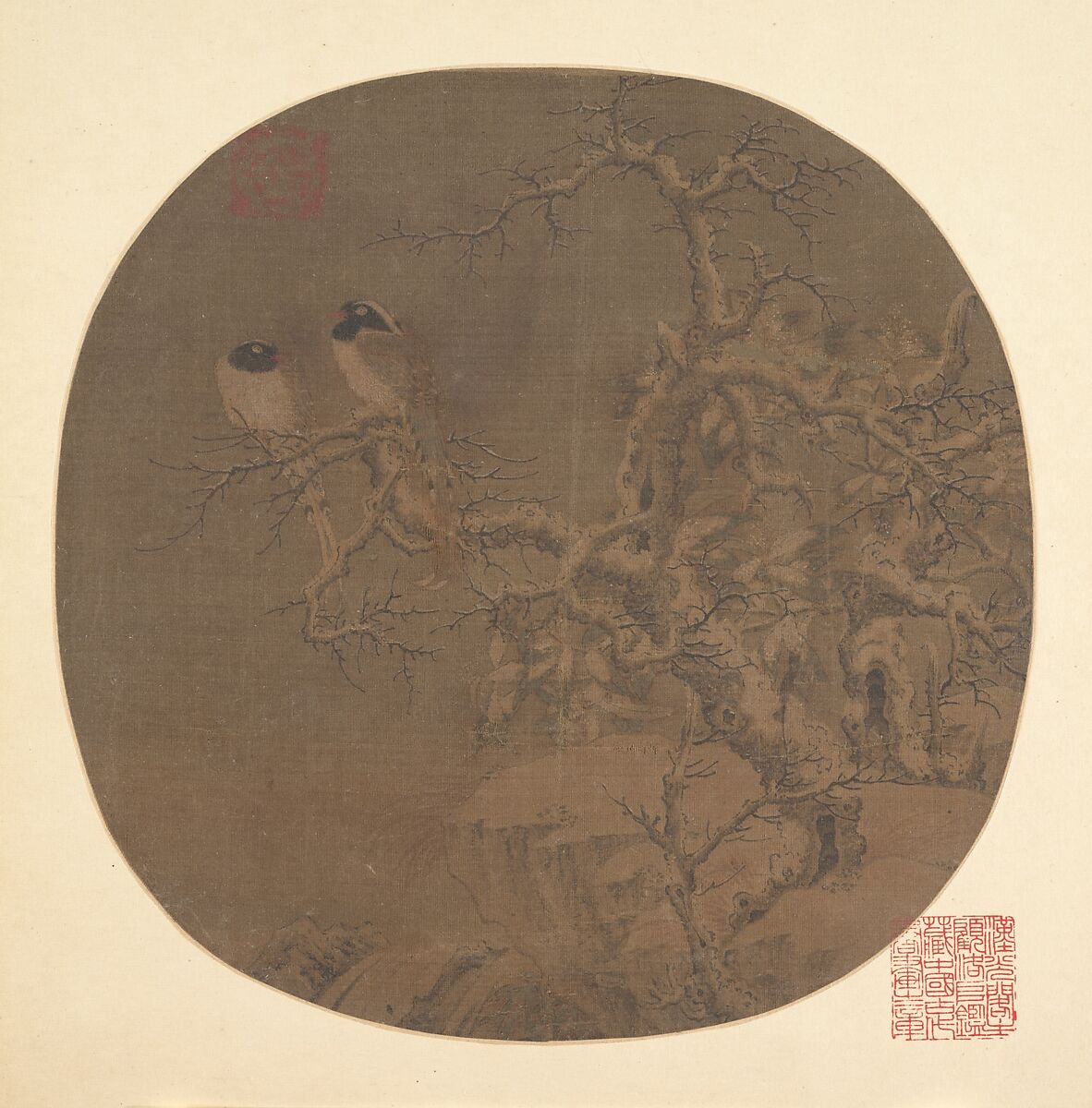 Two magpies, their feathers fluffed up against the cold, represent a warm reminder of the inevitability of spring. Such pictures of paired birds were often given as birthday gifts to elderly couples. The white heads of the birds and their long tail feathers are symbols of longevity, as is the ancient tree upon which they perch, for despite being covered with snow, the tree has already sprouted new growth—a sign of its enduring vigor.