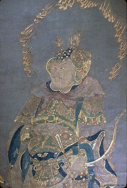 The elaborately dressed figure with a flaming halo holding a bow and arrow is one of the Buddhist guardian kings of the four cardinal directions. (The arrow suggests he may be associated with the east, despite the inscription on the mounting, which identifies him as the guardian of the west.)