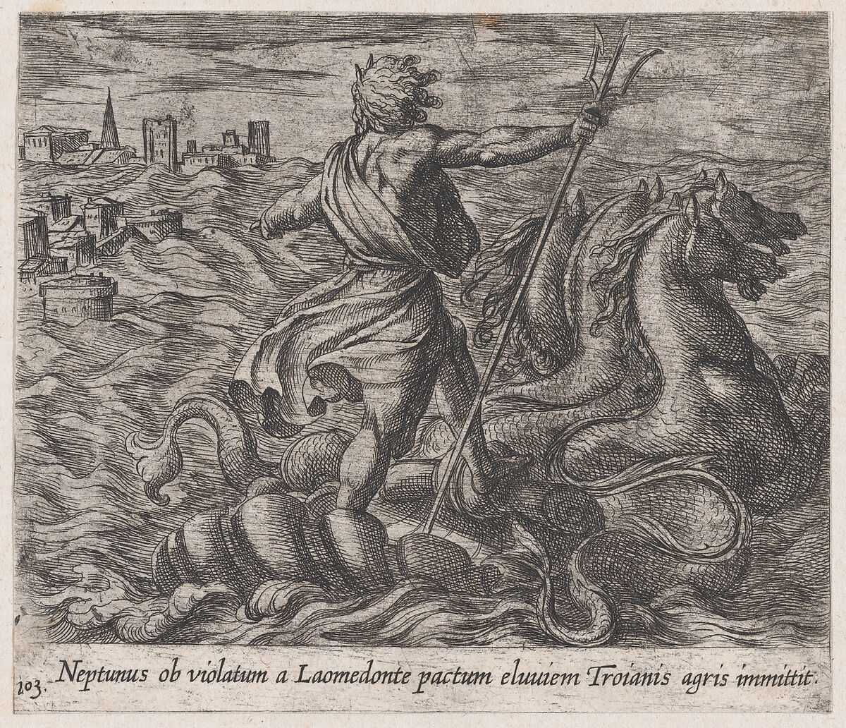 - Title: Plate 103: Neptune Sending a Deluge to Troy (Neptunus ob violatum a Laomendonte pactum eluviem Troianis agris immittit), from Ovid's 'Metamorphoses'