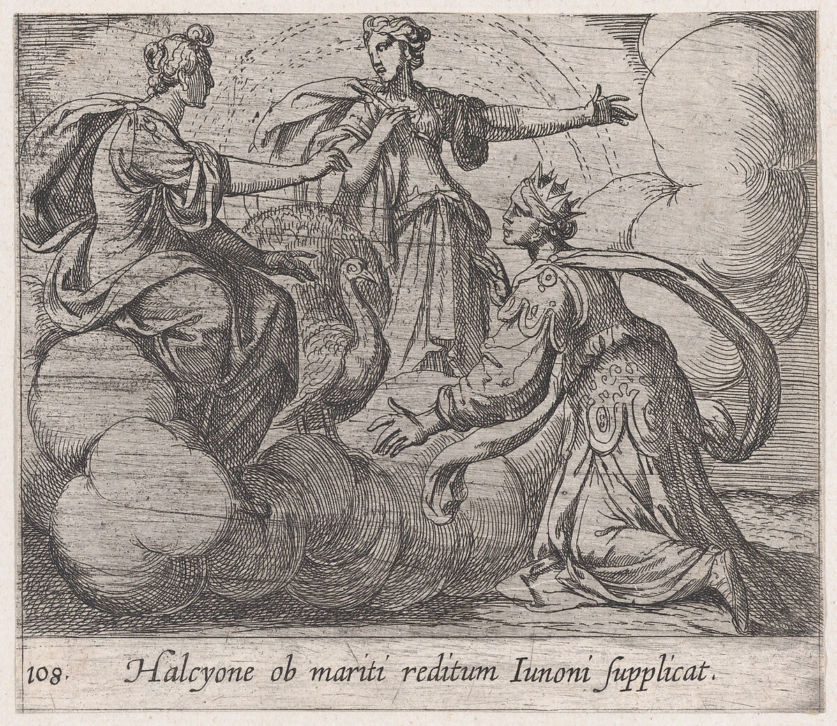 - Title:Plate 108: Alcyone Offering Prayers to Juno (Halcyone ob mariti reditum Iunoni supplicat), from Ovid's 'Metamorphoses'