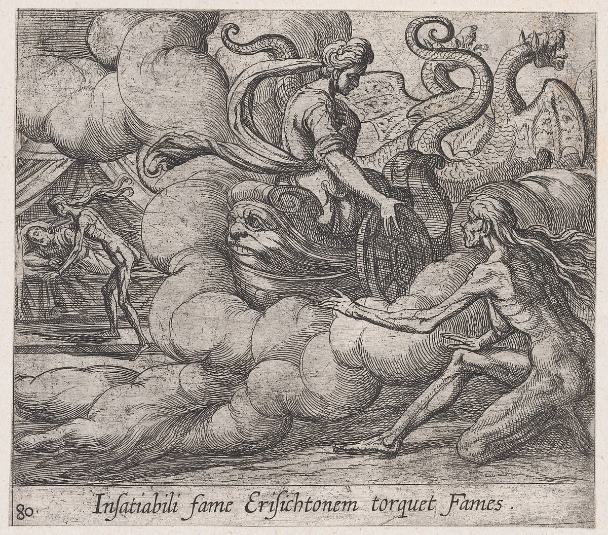 - Title:Plate 80: Ceres' Nymph Telling Famine to Strike Erysichthon (Insatiabili fame Erisichtonem torquet Fames), from Ovid's 'Metamorphoses'