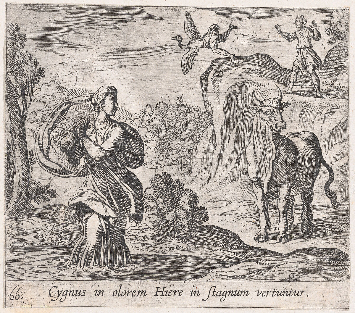 - Title:Plate 66: Cycnus and Hyrie (Cygnus in olorem Hiere in stagnum vertuntur), from Ovid's 'Metamorphoses'