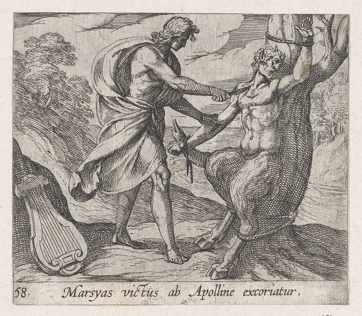 - Title: Plate 58: Apollo Killing Marsyas (Marsyas victus ab Apolline excoriatur), from Ovid's 'Metamorphoses'