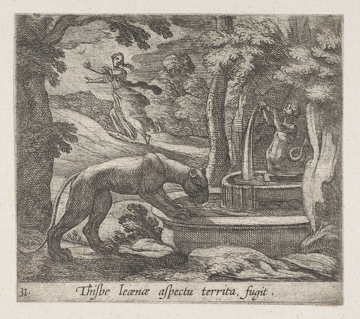 - Title: Plate 31: Thisbe Running from the Lionness at the Well (Thisbe leaenae spectu territa fugit), from Ovid's 'Metamorphoses'