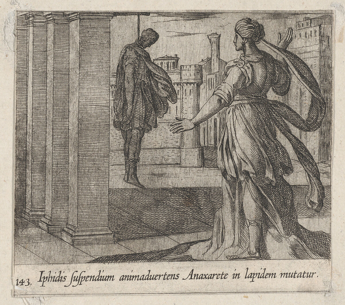 - Title:Plate 143: Anaxarete Seeing the Dead Iphis (Iphidis suspendium animaduertens Anaxarete in lapidem mutatur), from Ovid's 'Metamorphoses'