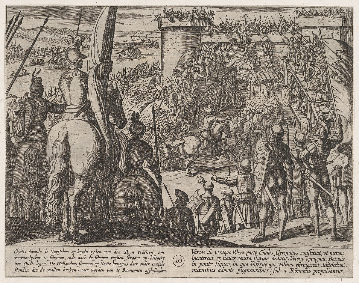 - Title: Plate 10: Civilis using Movable Wooden Bridges to Attack the Fortress, from The War of the Romans Against the Batavians (Romanorvm et Batavorvm societas)