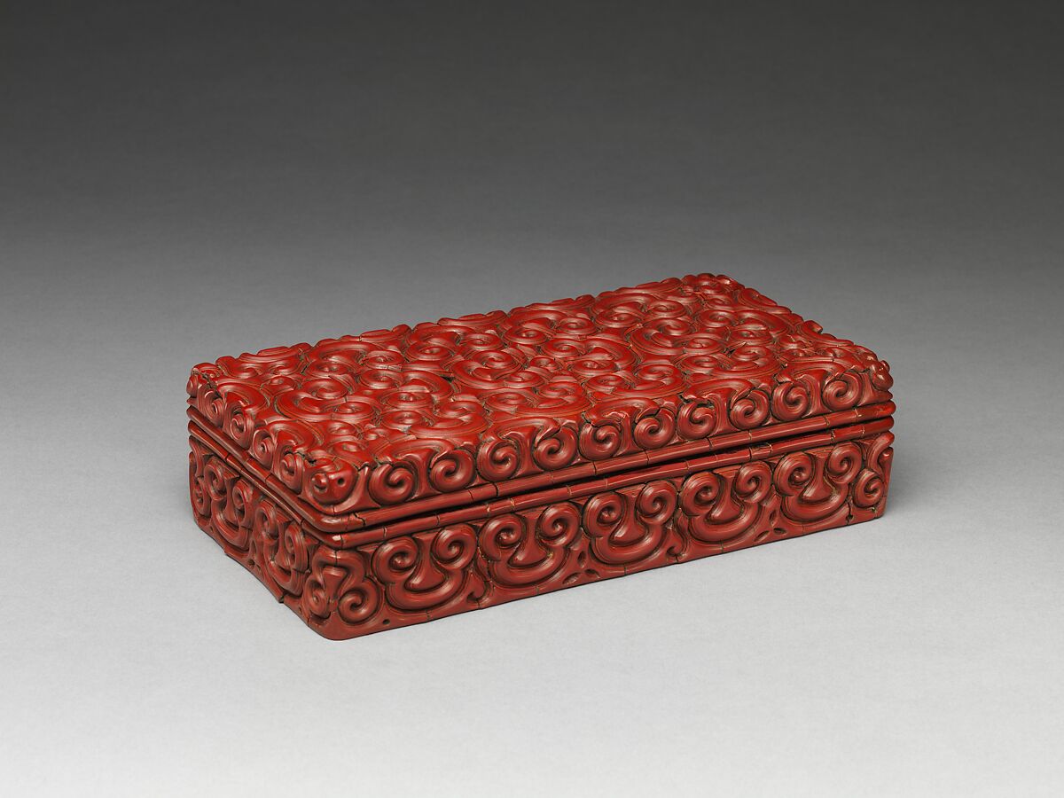 The pommel scroll is so-named because it resembles the shape of a Chinese sword pommel. This design is often seen in objects decorated with layers of contrasting colors of lacquer, particularly red and black. Found predominantly on ceramics, metalwork, and lacquer from the thirteenth century, there is no known explanation for the creation and popularity of this motif. However, it may have been inspired by the antiquarianism of the period, when motifs that were based on, or presumed to be based on, the Chinese Bronze Age were incorporated into the designs of many types of objects.