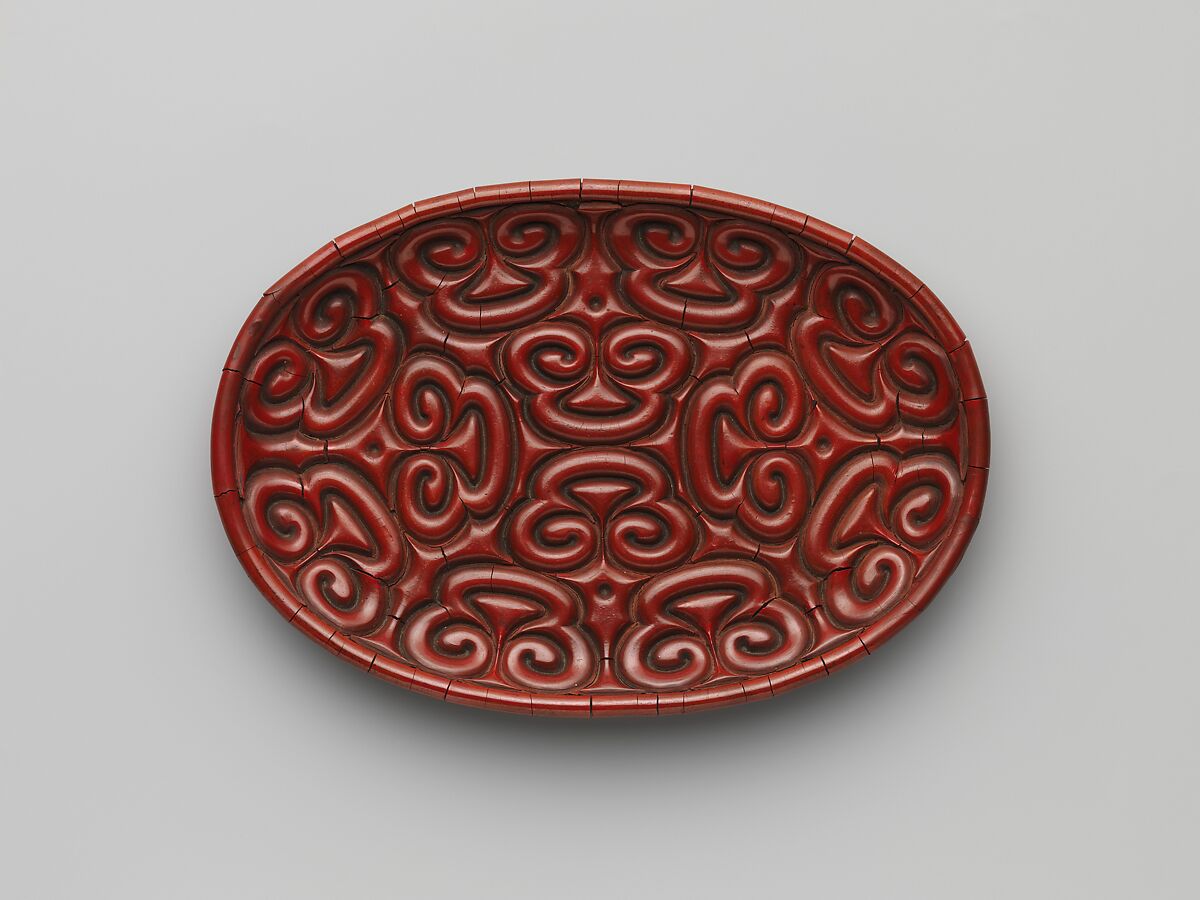 Layers of black lacquer applied between the red ones enhance this tray’s surface appearance and contribute to the vivacity of the scroll design.