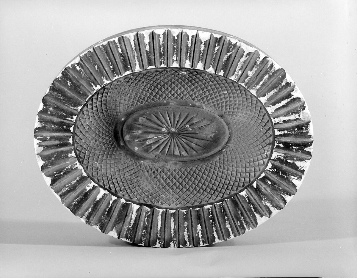 This plaster-of-Paris mold has intaglio decoration in a diamond pattern. Molds such as this were used to make other, more durable molds out of metal, which glassmakers used to make pressed glass. This mold and the other glassmaking implements were found in the cellar of the Union Glass Works, Somerville, Massachusetts, which had probably bought the objects from a glassmaker in Sandwich, an active glassmaking center during the nineteenth century.
