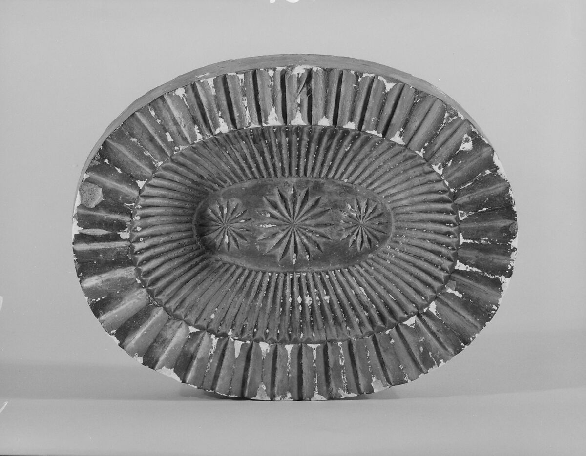 This plaster-of-Paris mold has intaglio decoration of grooves surrounding a central reserve containing a floral pattern. Molds such as this were used to make other, more durable molds out of metal, which glassmakers used to make pressed glass. This mold and the other glassmaking implements were found in the cellar of the Union Glass Works, Somerville, Massachusetts, which had probably bought the objects from a glassmaker in Sandwich, an active glassmaking center during the nineteenth century.