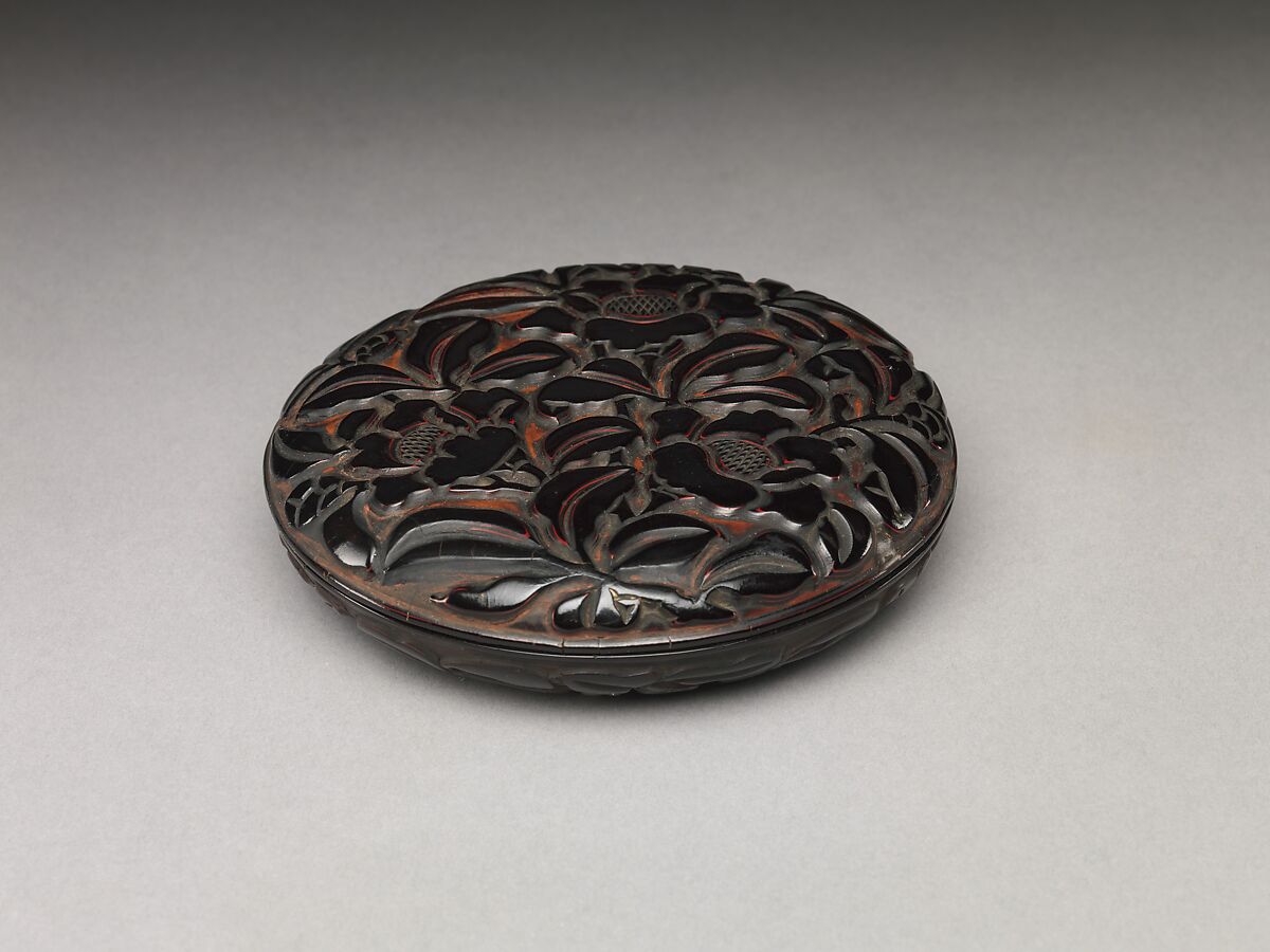 The lacquer body is built on a red-orange ground and has a thin layer of lacquer near the top that outlines the camellia blossoms and leaves in red, an allusion to the color of this flower that blooms around the Chinese New Year. As is typical of the thirteenth century, there is little overlapping of leaves and petals, and much of the ground is exposed. The lack of incisions to indicate the veins of the petals and leaves is another thirteenth-century characteristic.