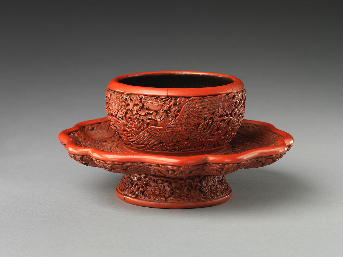 Phoenixes are often associated with imperial women. The sharpness of the outlines and decoration on this tea-bowl stand is typical of works produced at court in the early fifteenth century. Lacquer stands of this type were used to hold ceramic bowls, following the tradition from the Song dynasty (960–1279).