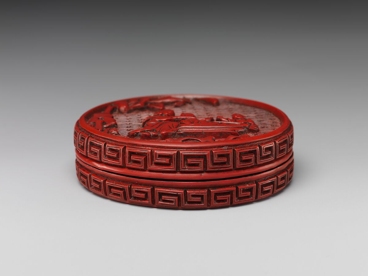 This tiny box, previously thought to date to the sixteenth century, can be reassigned to the fourteenth after comparison with an example bearing an image of the poet Tao Qian, which dates to the first half of the fourteenth century. The large, unarticulated shapes of the rocks and the use of a single pattern for the low-relief background are similar on both boxes, as are the thick incisions used to define the figures' clothing and the large oval faces with nondescript features.