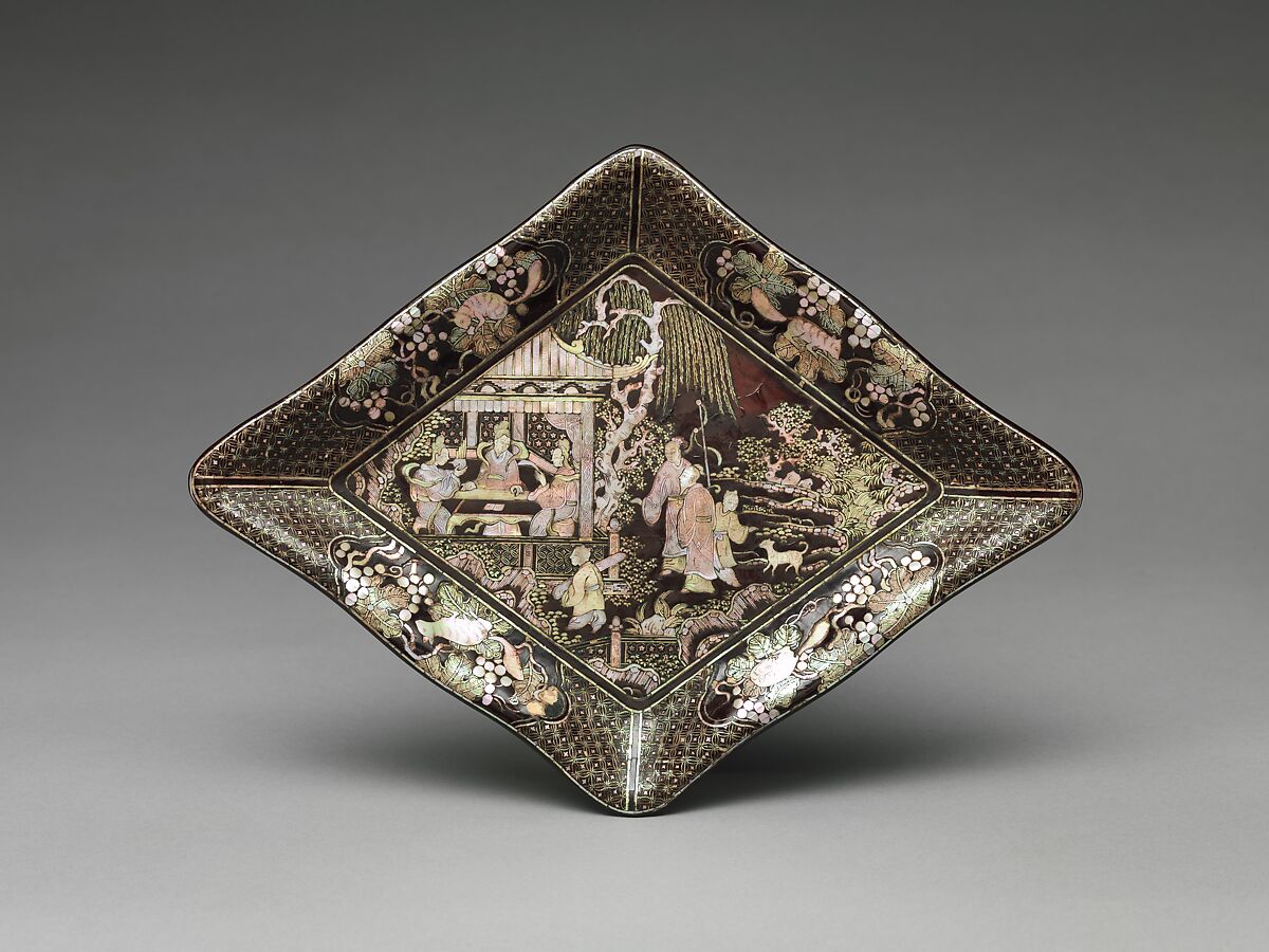 - 明晚期 黑漆嵌螺鈿遊園賞樂圖菱形盤