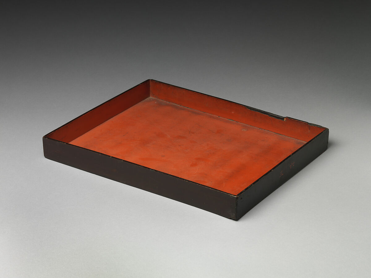 Long use as a container for sutras is indicated by the shadowy imprint of ten scrolls visible on the bright red lacquer interior of this finely made rectangular box. That it was one of a number of trays for a large set of scrolls is suggested by the number thirty-six written in red on black lacquer on one side of the exterior.