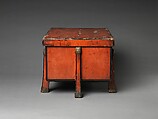 The karabitsu (literally, Chinese chest) is a rectangular lidded chest raised on four legs. The name implies a foreign origin for this elegant and functional form, used in Japan since the Nara period (645–794) to store precious objects, but no prototype has survived in China. Although its origin is obscure, the form is well suited to Japanese usage, highly functional for storage in a humid climate and attractive for display in the sparely furnished interiors of traditional architecture. Early extant examples from the twelfth century are black with mother-of-pearl inlay, although a similar undecorated red lacquer chest is recorded to have been made in 1040 for the sacred mirror, one of the three imperial regalia. In its earliest form, the box was square with taller legs; the proportions of this later chest, with shorter and wider legs, give it a more solid appearance. Despite the damage to the lacquer on its lid, this richly colored chest is a prime example of Muromachi-period Negoro lacquerwork.