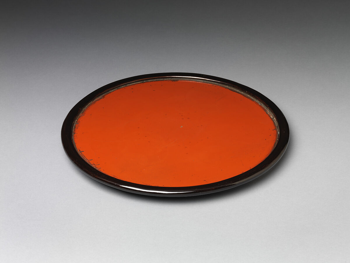 The underside and curved rim of this tray, with a low wide ring foot, are lacquered to a glossy black that contrasts with the red surface. Inscribed in red lacquer on the black underside is the name of the Tōdaiji temple. Such objects, familiarly known as "rising sun trays" (Hinomaru-bon) after their resemblance to the Japanese national flag, are used to serve meals to monks during the two-week shuni-e ritual of purification performed annually at the Hokkedō hall in the Tōdaiji temple complex in Nara. The ceremony marks the beginning of the Buddhist liturgical calendar and invokes peace and prosperity for the nation.