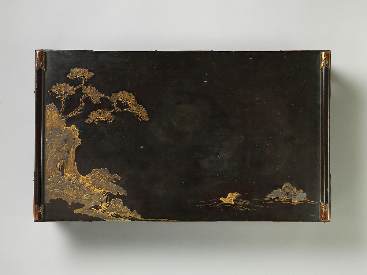 Lacquer writing desks were usually created in sets with boxes (suzuribako) to hold paper and writing implements. The earliest forms of the low table are documented in medieval handscroll paintings; most are undecorated and have shorter legs. The size and shape of the writing table became standardized in the Muromachi period (1392–1573) and remained unchanged through the Edo period, as seen in paintings representing Murasaki Shikibu at her desk composing The Tale of Genji. This desk, prepared in homage to earlier examples, has a landscape with a waterfall and geese among waves. The maki-e decoration covers only a small portion of the writing surface, in keeping with the desk’s function. The style of the sparse decoration recalls Japanese appreciation of Chinese ink paintings introduced by Zen monasteries.
