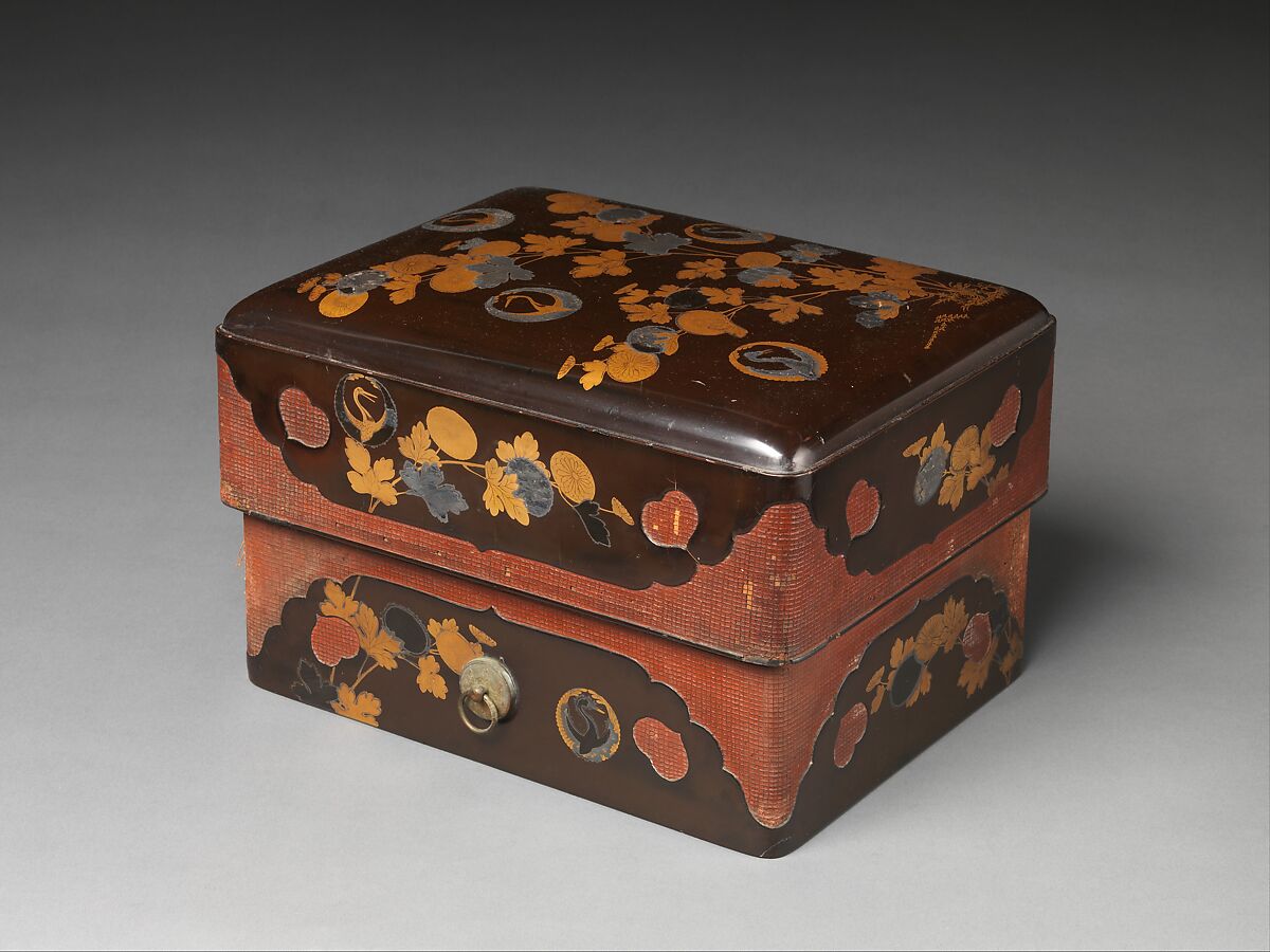 - Medium: Gold maki-e and silver foil inlay on black lacquer, red lacquer over coarse cloth