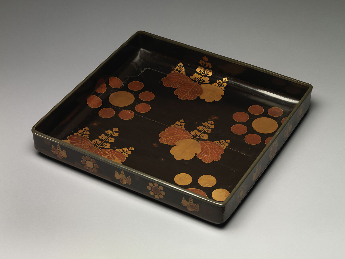The midarebako—a shallow traylike box used to temporarily hold folded clothing and small accessories—developed from a Heian-period (794–1185) predecessor. It was typically used when dressing or changing, for keeping things nearby at night, or while women arranged their hair. The shape indicates that larger boxes’ lids might originally have been used for the same purpose. This Kōdaiji-style version is embellished with maki-e paulownia crests associated with Toyotomi Hideyoshi and nine-orb (kuyō) crests used predominately by the Hosokawa family.