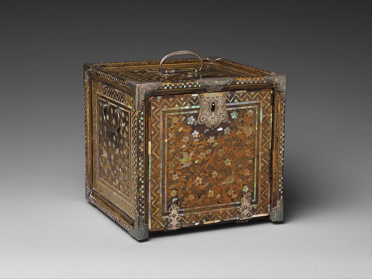 This cabinet belongs to a category of goods known as nanban (literally, "southern barbarians"), which were produced in Japan in the late sixteenth and early seventeenth centuries for trade with Portugal and other European countries. The form of the cabinet derives from writing chests used in Portugal and Spain. Comparable works, made with wood, lacquer, mother-of-pearl, and ivory, were produced in India for the same markets. The leaves and flowers and the geometric borders seen here are not found on contemporaneous works made for use in Japan. It is possible that they demonstrate an awareness of Indian designs transmitted via such trade goods as lacquers and textiles.