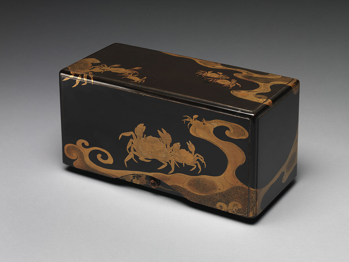 The somewhat unusual shape of this box suggests that it might have been used to hold implements for painting, such as ink stones, brushes, and pigments. Variations in texture on the crab shells and in the rendering of the dramatic waves are a result of the different sizes and densities of the sprinkled gold, and of the various methods used to apply the gold powder. This box, with its bold and decorative design, could have been used by a well-to-do individual living in a cultural center such as Edo (present-day Tokyo)or Kyoto.