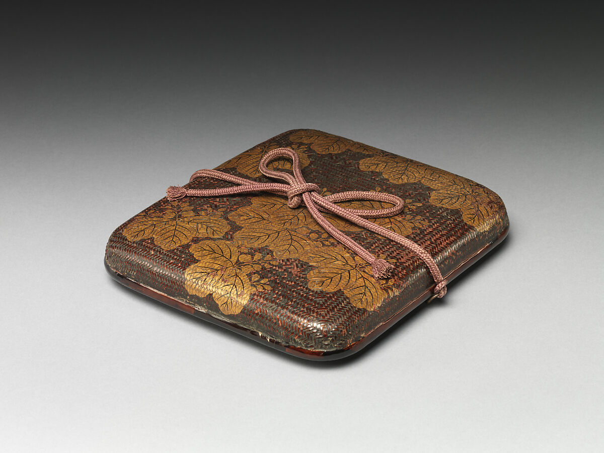 The light, durable bodies of Japanese lacquered basketry works (rantai shikki) were sometimes further decorated with designs in sprinkled gold powder (maki-e), transforming everyday objects into opulent treasures. This box, designed to hold square calligraphy paper (shikishi), bears large gold paulownia crests, a popular design from the late sixteenth to the early seventeenth century associated with the powerful warlord Toyotomi Hideyoshi (1536–1598).