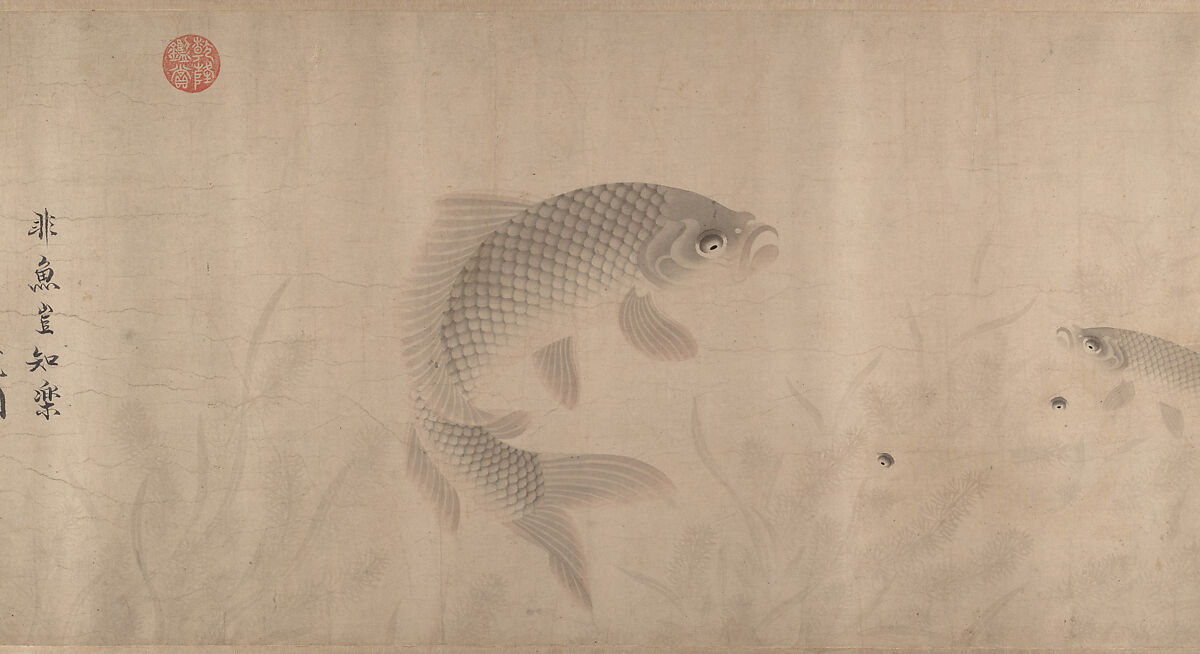 Zhou Dongqing was a friend of Wen Tianxiang (1236–1283), the famous Song loyalist and a fellow native of Jiangsi Province. Zhou's painting was inspired by a passage from the Daoist classic Zhuangzi (ca. fourth century B.C.), in which Zhuangzi, strolling along a river, observes, "See how the minnows come out and dart around where they please! That's what fish really enjoy!" His companion Huizi remarks, "You're not a fish—how do you know what fish enjoy?" Zhuangzi replies, "You are not I, so how do you know I don't know what fish enjoy?"