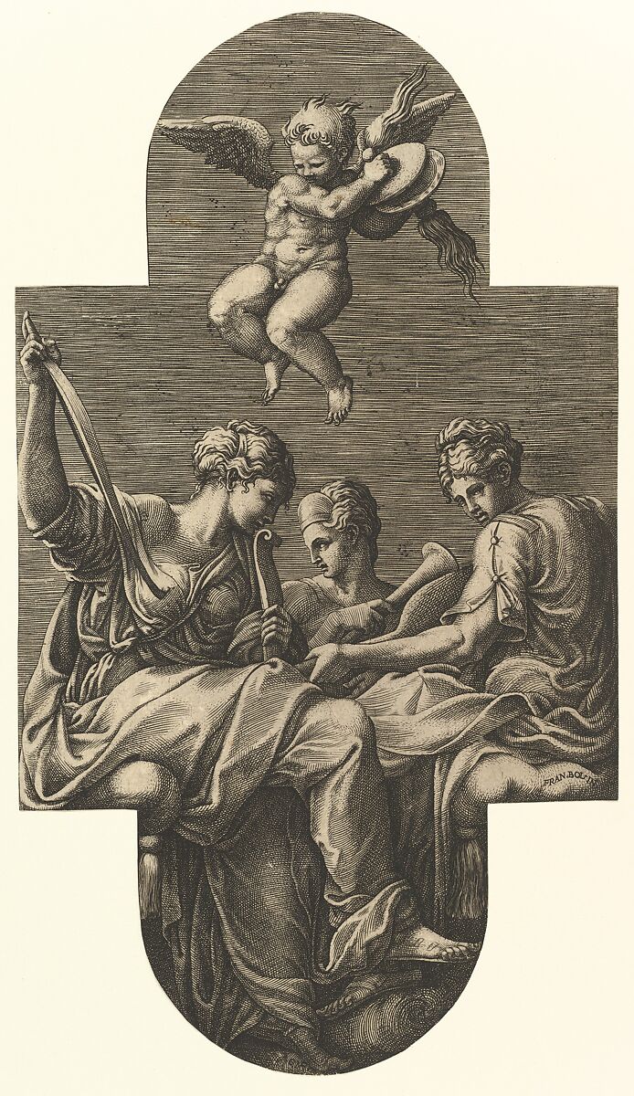 - Title: Three Muses and a Putto with Cymbals, from a series of eight compositions after Francesco Primaticcio's designs for the ceiling of the Ulysses Gallery (destroyed 1738-39) at Fontainebleau