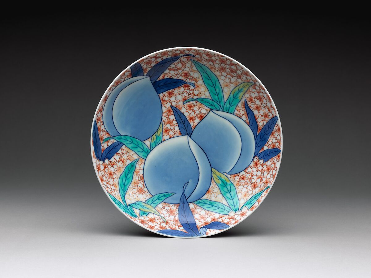This Nabeshima dish is exquisitely designed. The auspicious motif of peaches, symbolizing longevity, appears almost three-dimensional at its center, an effect achieved through the masterful gradation of cobalt blue. As the meal was finished, the revelation of this image would have delighted the diner. In general, the theme of longevity was closely linked to food itself, in that nourishing the body was believed to bring lasting reward.