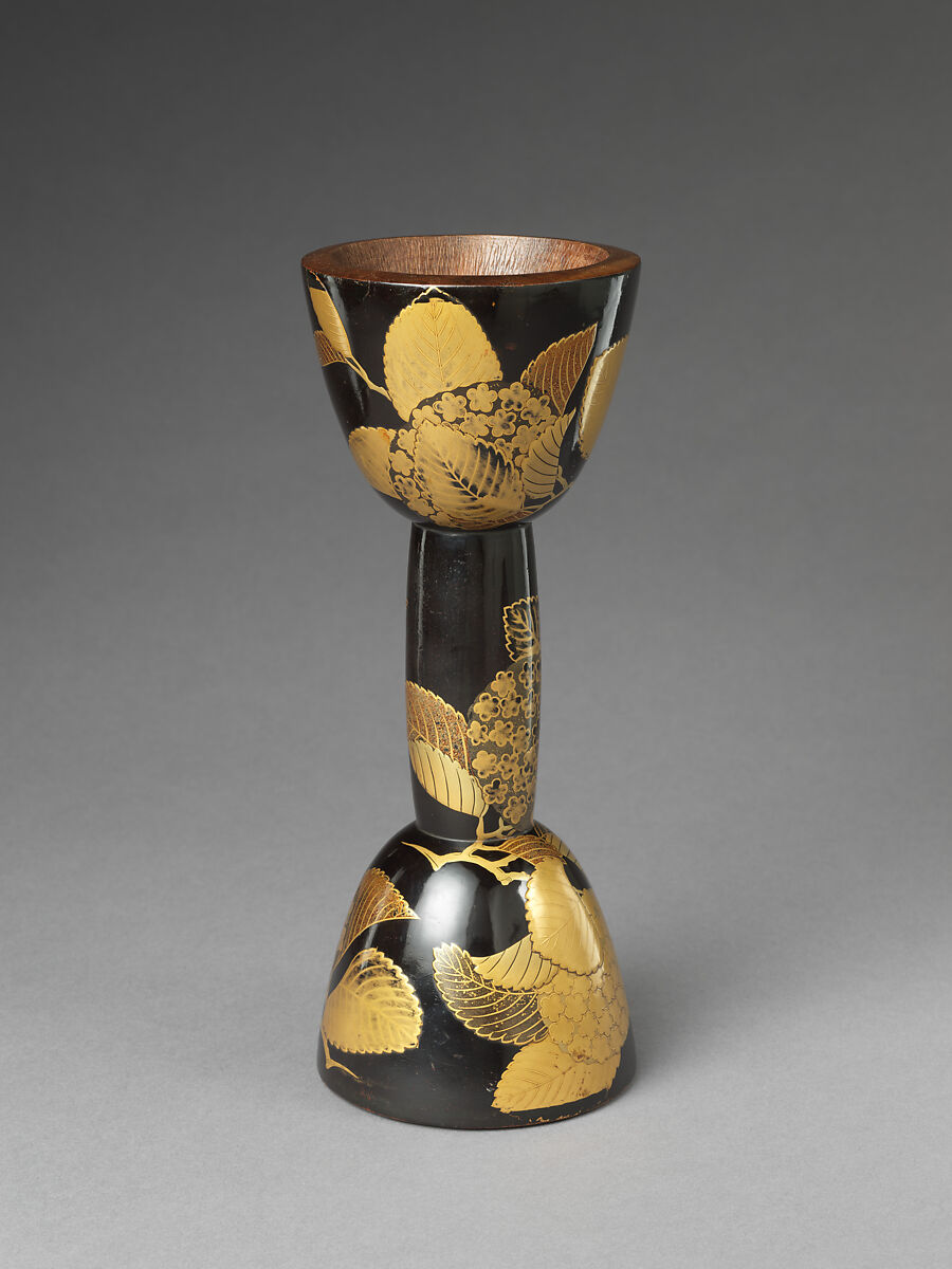 In Japan, small hand drums called kotsuzumi, and the slightly larger ōtsuzumi, were played at temple dedications, for sarugaku and shirabyōshi dances of the Kamakura period (1185–1333), and formed an important part of the musical accompaniment for the Noh and later the Kabuki theatre. Examples of double-headed, waisted drums were also used in popular entertainments until the end of the Edo period (1615–1868). The hourglass shape that characterizes this piece and other examples of tsuzumi reflects the manner of its use; the drum was held over the left shoulder, and the horsehide traditionally lashed to the core, to cover each cup-shaped drum head, would be struck with the palm of the right hand. The wooden body of this drum core was covered with layers of black lacquer upon which the flat maki-e (sprinkled gold) design was applied. Some of the lines were left in black reserve, while others were executed in gold hiramaki-e. The hydrangea, a symbol of early summer, was an appropriate design for drum bodies, as the changing colors of its petals also represented a quality valued in music.