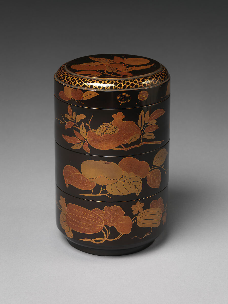 - Title: Cylindrical Stack of Food Boxes with Decoration of Autumn Fruits