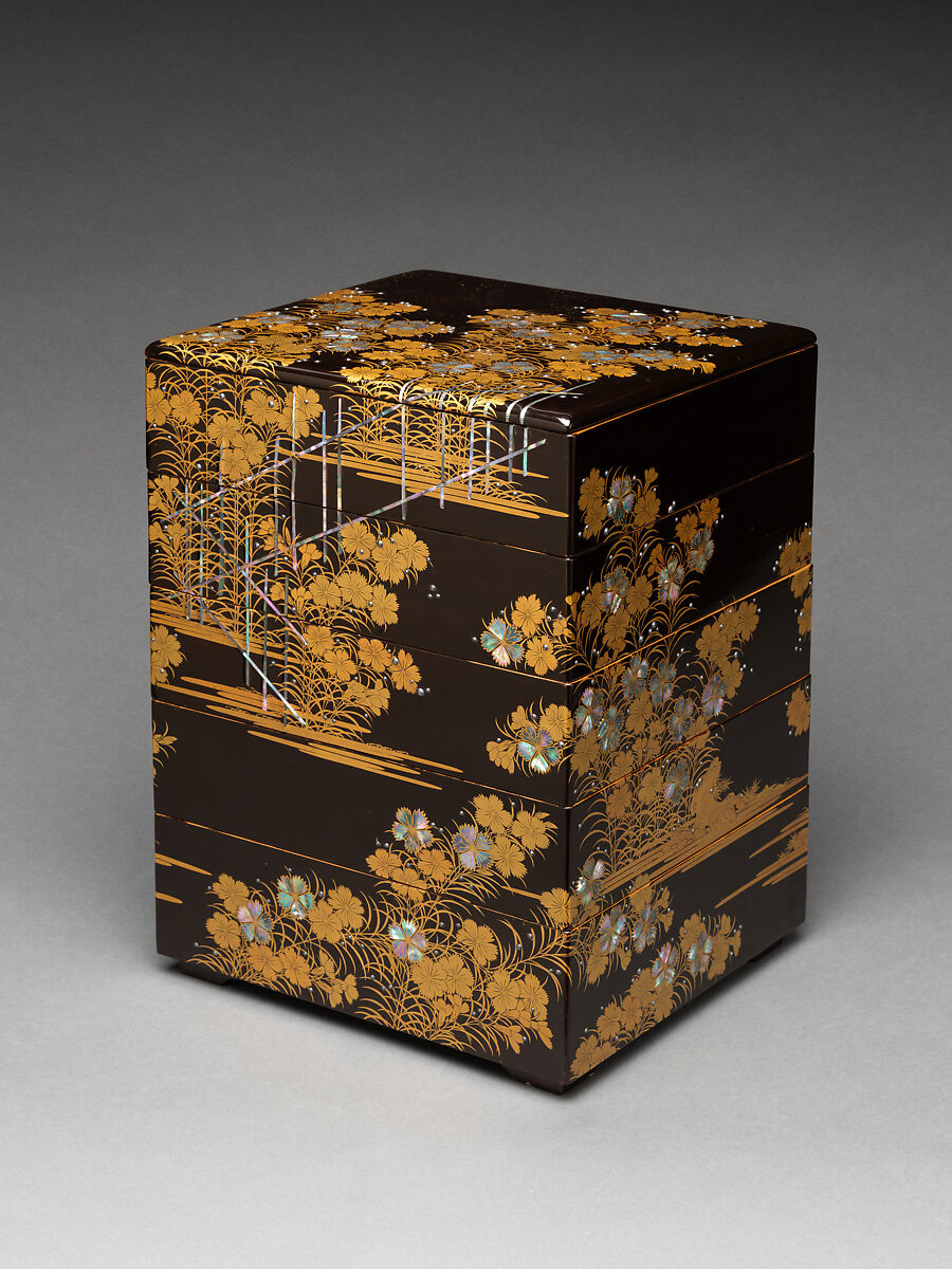 - Medium:Gold maki-e, inlaid mother-of-pearl, and applied silver on black lacquer