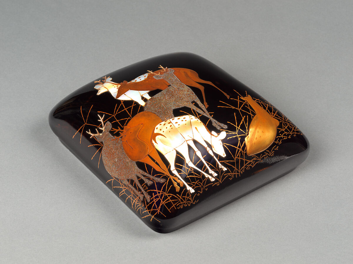 - Medium: Gold maki-e, inlaid mother-of-pearl, and lead on black lacquer