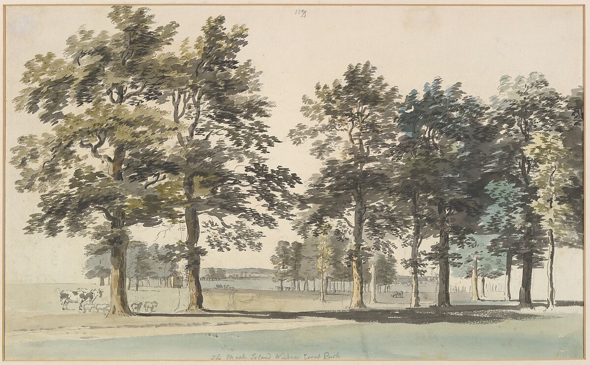 Thomas Sandby, and his brother Paul, helped to establish watercolor as a nuanced and expressive medium associated with British art. Both worked as military surveyors until 1746, when Thomas was appointed deputy ranger of Windsor Great Park by the duke of Cumberland, George III’s younger brother. This composition resembles the artist’s designs for Eight Views of Windsor (1754–55), a set of etchings. Mote (or Moat) Park is crossed by two tributaries of the Bourne Ditch, whose fortified meeting point lends the location its name. Graphite lines were applied freely on site, then developed with colored washes that sometimes ignore sketched elements. Cows and sheep dot a lawn bordered by trees before a distant body of water.
