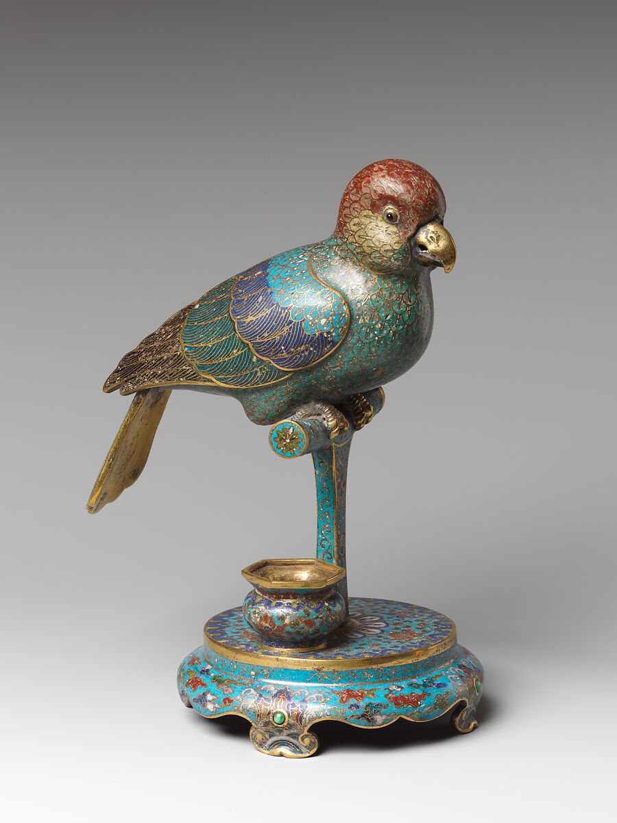 During the Qianlong period, artisans working with cloisonné enamels expanded their repertoire to create three-dimensional representations of birds and other animals, depictions that have a long history in Chinese bronze casting. These parakeets could have been loosely modeled on prints of bronze antiquities, or inspired by the famous five-colored parakeet painted by Song-dynasty emperor Huizong (r. 1100–1126) as an auspicious omen. The polychrome possibilities of cloisonné enamels lent themselves particularly well to this colorful subject.