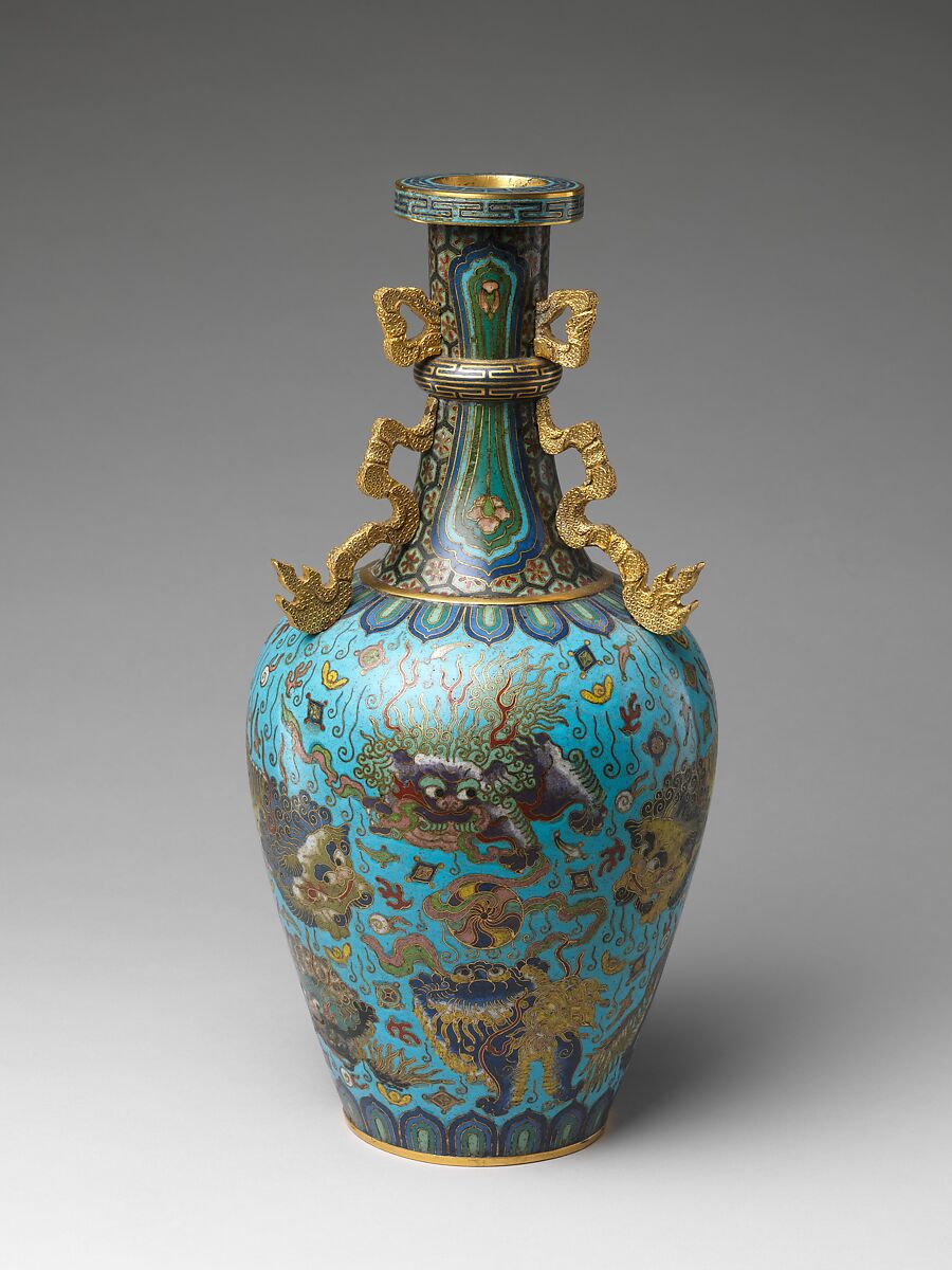 The doglike lions cavorting on the surface of this vase are often known as Fu dogs in the West. Fu, or fo, is the Chinese word for Buddha, and the creatures were probably so named because they are often found in temples or monastic compounds. Here they are placed among various emblems of good luck and fortune, such as flaming pearls, coral branches, and silver ingots.