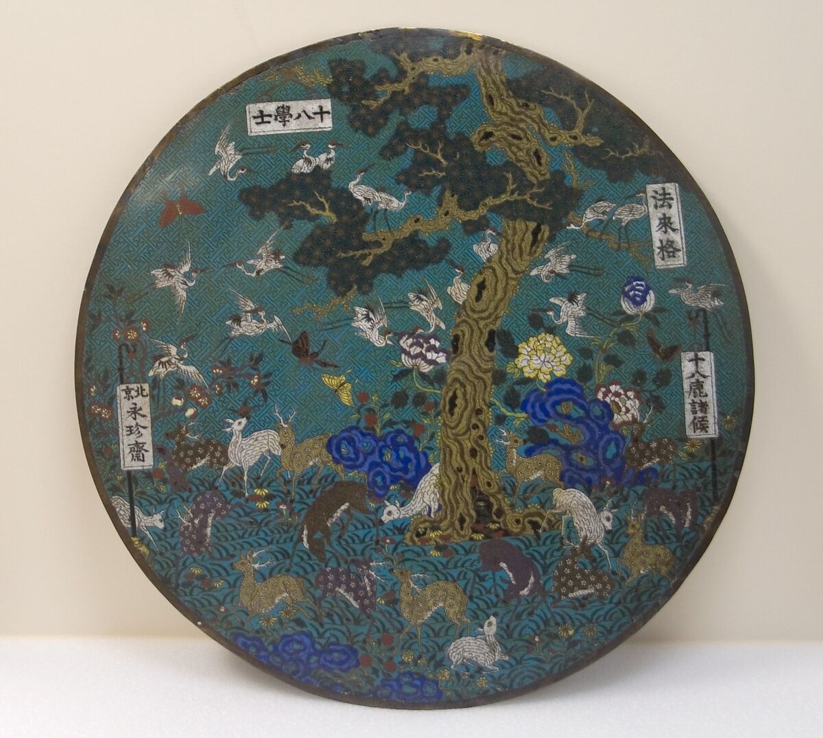 Deer and cranes are ubiquitous Chinese motifs symbolic of good wishes, as is the pine tree in the center of this plaque. Similar themes are reiterated in two of the inscriptions. The inscription written on a banner suspended at the lower left is the name of an antiques shop active in Beijing in the late nineteeth and early twentieth centuries; that at the upper right records the Chinese name of E. Farago, a custom's officer who was influential at the court of the Guangxu Emperor (r. 1871–1908).