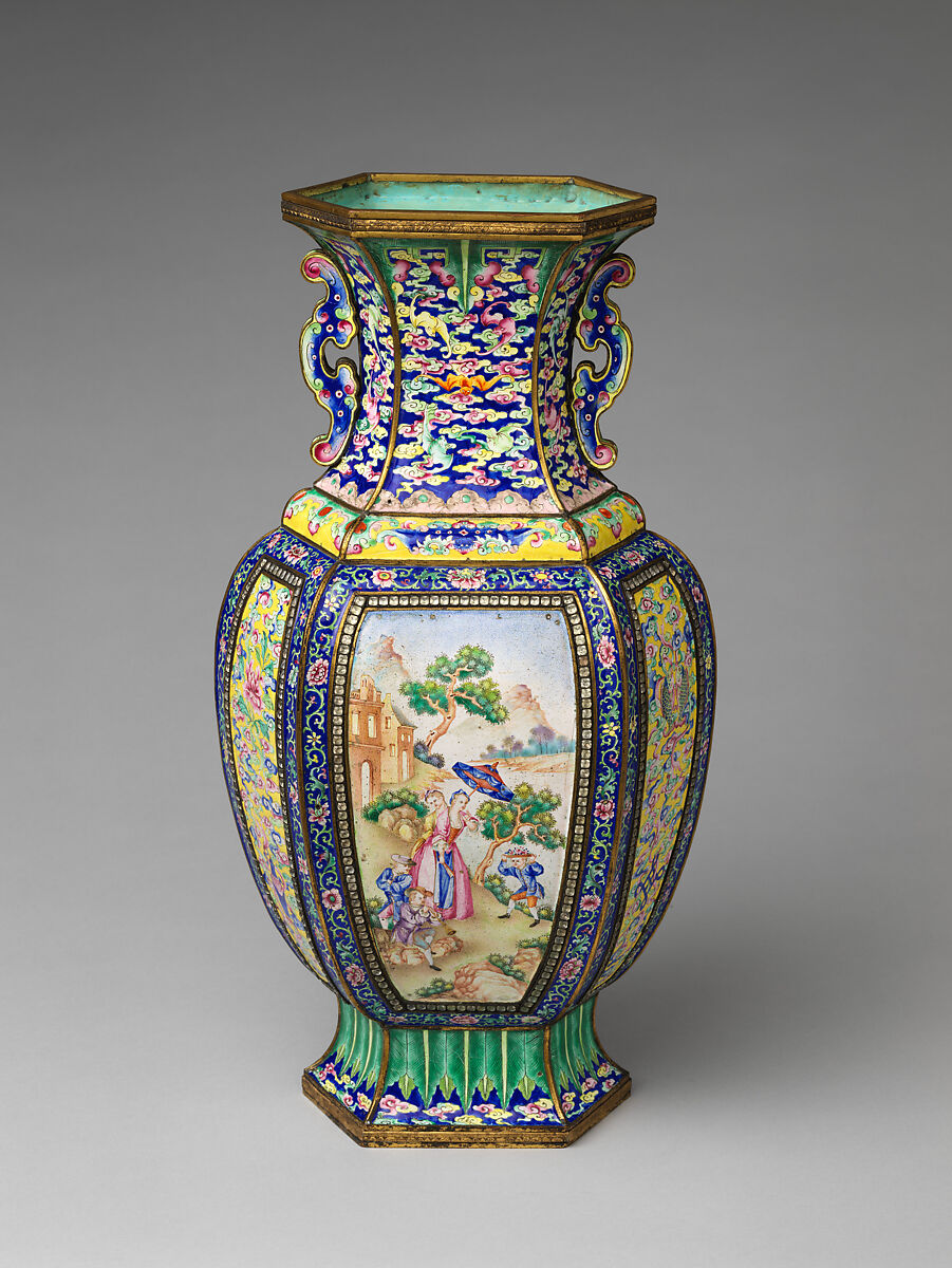 Profusely ornate, this vase reflects Chinese interests in European imagery and pictorial techniques during the eighteenth century. Chinese artists used a new palette of opaque enamels to create shading that could replicate Western painting styles. The stippling on the sky and ground, as well as the horizontal lines on the surface of the body of water, may indicate that a European copperplate etching served as the pictorial source for the vignette.